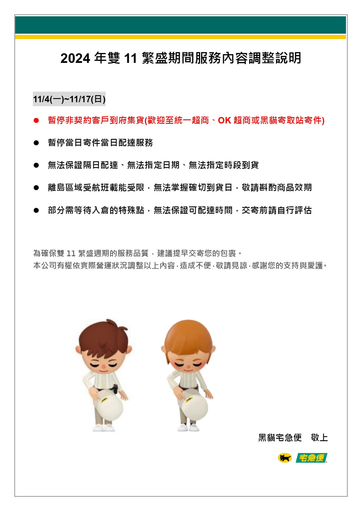 因應配合黑貓宅急便之雙11配送繁忙期,